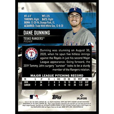 This is a 2021 Stadium Club Dane Dunning baseball card. The card is #61 and pictures show condition.