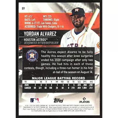 This is a 2021 Stadium Club Yordan Alvarez baseball card. The card is #89 and pictures show condition.