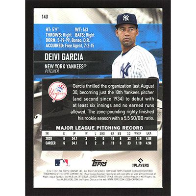 This is a 2021 Stadium Club Black Foil Deivi Garcia baseball card. The card is #140 and pictures show condition. Team(s): New York Yankees Rookie Card (RC)