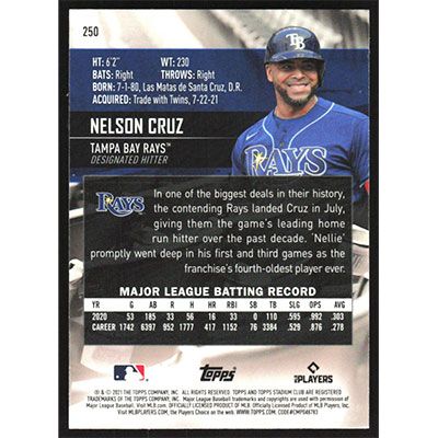 This is a 2021 Stadium Club Chrome Nelson Cruz baseball card. The card is #250 and pictures show condition.