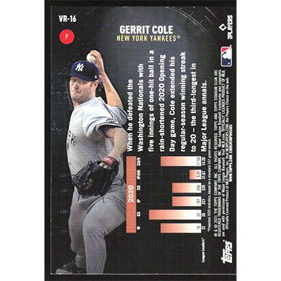 This is a 2021 Stadium Club Virtual Reality Gerrit Cole baseball card. The card is #VR-16 and pictures show condition.