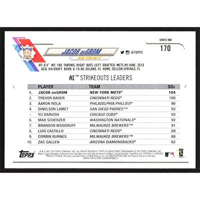 This is a 2021 Topps Jacob deGrom League Leaders baseball card. The card is #170 and pictures show condition.