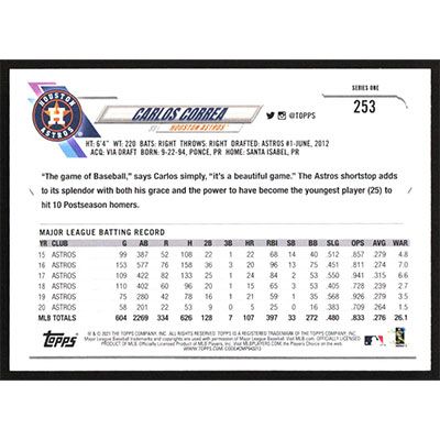 This is a 2021 Topps Carlos Correa baseball card. The card is #253 and pictures show condition.