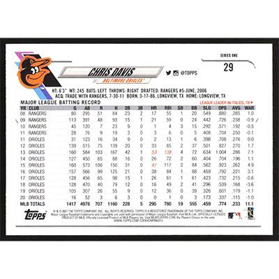 This is a 2021 Topps Chris Davis baseball card. The card is #29 and pictures show condition.