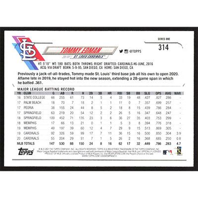 This is a 2021 Topps Tommy Edman baseball card. The card is #314 and pictures show condition.
