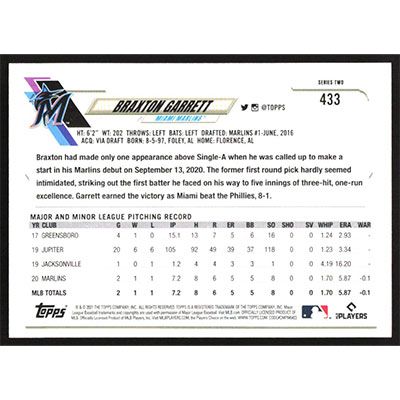 This is a 2021 Topps Braxton Garrett baseball card. The card is #433 and pictures show condition.