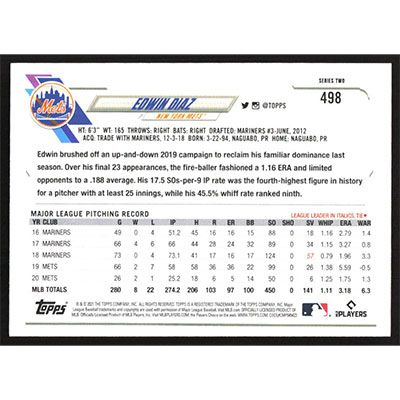 This is a 2021 Topps Edwin Diaz baseball card. The card is #498 and pictures show condition.