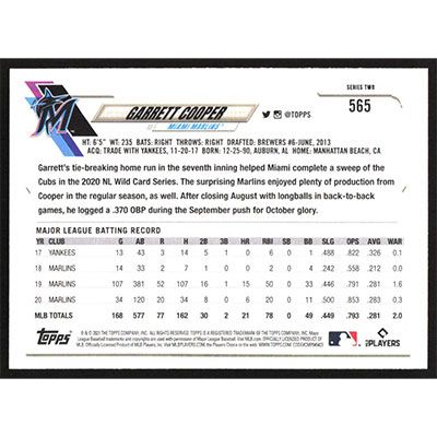 This is a 2021 Topps Garrett Cooper baseball card. The card is #565 and pictures show condition.