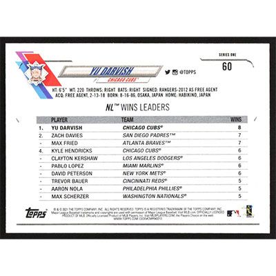 This is a 2021 Topps Yu Darvish League Leaders baseball card. The card is #60 and pictures show condition.