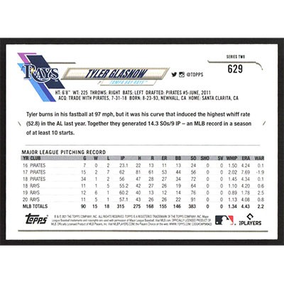 This is a 2021 Topps Tyler Glasnow baseball card. The card is #629 and pictures show condition.