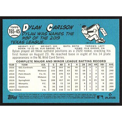 This is a 2021 Topps '65 Redux Dylan Carlson baseball card. The card is #T65-45 and pictures show condition. Team(s): St. Louis Cardinals Rookie Card (RC)