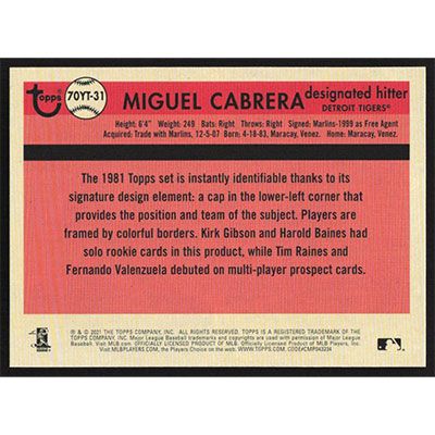 This is a 2021 Topps 70 Years of Topps Miguel Cabrera baseball card. The card is #70YT-31 and pictures show condition.