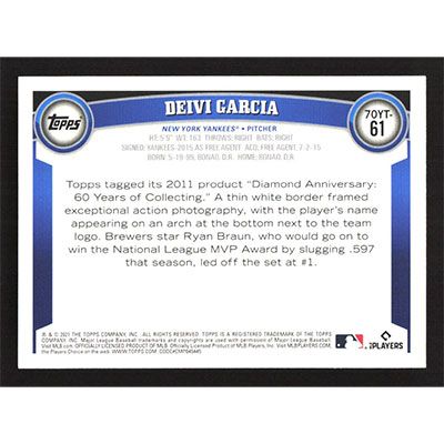 This is a 2021 Topps 70 Years of Topps Baseball Series 2 Deivi Garcia baseball card. The card is #70YT-61 and pictures show condition. Team(s): New York Yankees Rookie Card (RC)