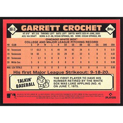 This is a 2021 Topps '86 Series 2 Garrett Crochet baseball card. The card is #86B-39 and pictures show condition. Team(s): Chicago White Sox Rookie Card (RC)