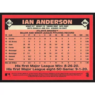 This is a 2021 Topps '86 Silver Pack Chrome Ian Anderson baseball card. The card is #86BC-43 and pictures show condition. Team(s): Atlanta Braves Rookie Card (RC)