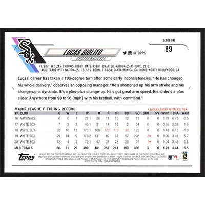 This is a 2021 Topps Lucas Giolito baseball card. The card is #89 and pictures show condition.
