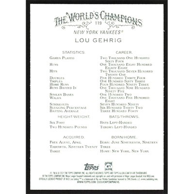 This is a 2021 Topps Allen & Ginter Lou Gehrig baseball card. The card is #119 and pictures show condition.
