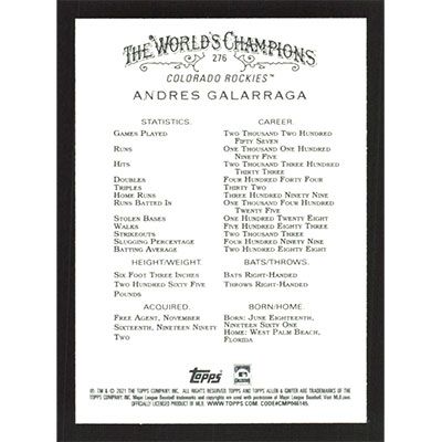This is a 2021 Topps Allen & Ginter Andres Galarraga autographed baseball card. This card has been signed, in blue, by Andres Galarraga, and is guaranteed authentic by Ballcardz.com. The card is #276 and pictures show condition.
