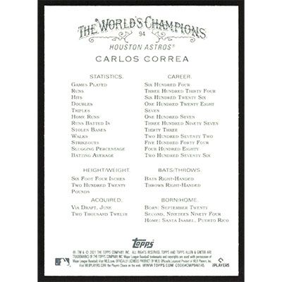 This is a 2021 Topps Allen & Ginter Carlos Correa baseball card. The card is #94 and pictures show condition.