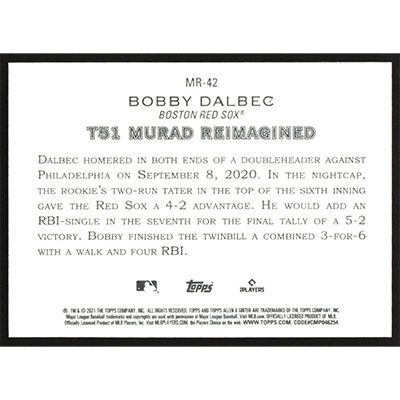 This is a 2021 Topps Allen & Ginter T51 Murad Reimagined Bobby Dalbec baseball card. The card is #MR-42 and pictures show condition. Team(s): Boston Red Sox Rookie Card (RC)