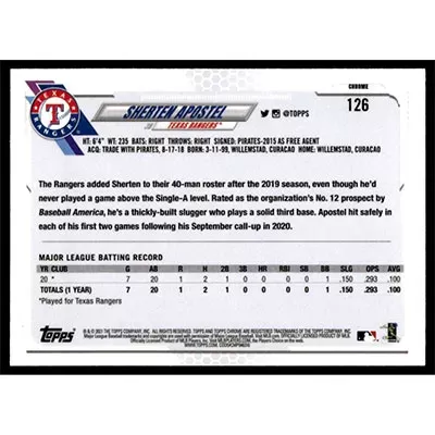 This is a 2021 Topps Chrome Sherten Apostel baseball card. The card is #126 and pictures show condition.