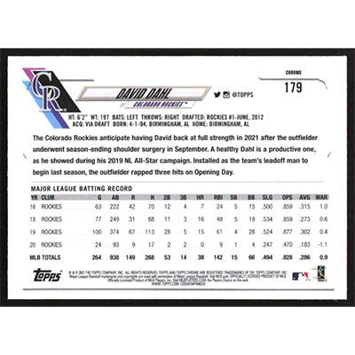 This is a 2021 Topps Chrome David Dahl baseball card. The card is #179 and pictures show condition.