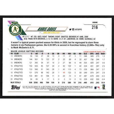 This is a 2021 Topps Chrome Pink Refractors Khris Davis baseball card. The card is #216 and pictures show condition.
