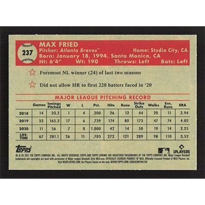 This is a 2021 Topps Chrome Platinum Anniversary Max Fried baseball card. The card is #237 and pictures show condition.