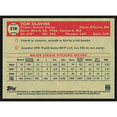 This is a 2021 Topps Chrome Platinum Anniversary Tom Glavine baseball card. The card is #510 and pictures show condition.