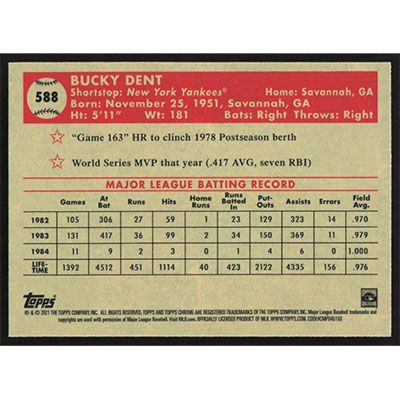 This is a 2021 Topps Chrome Platinum Anniversary Bucky Dent baseball card. The card is #588 and pictures show condition.