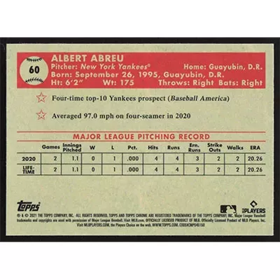 This is a 2021 Topps Chrome Platinum Anniversary Albert Abreu baseball card. The card is #60 and pictures show condition. Team(s): New York Yankees Rookie Card (RC)