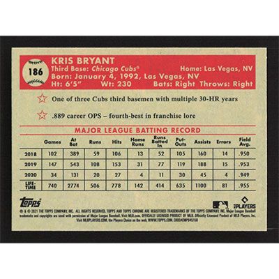 This is a 2021 Topps Chrome Platinum Anniversary Blue Prism Refractors Kris Bryant baseball card. The card is #186 and pictures show condition. Team(s): Chicago Cubs