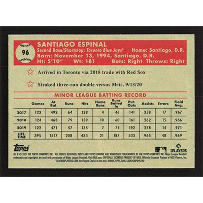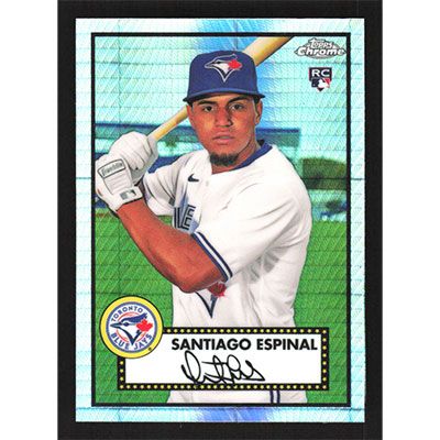 This is a 2021 Topps Chrome Platinum Anniversary Prism Refractors Santiago Espinal baseball card. The card is #96 and pictures show condition. Team(s): Toronto Blue Jays Rookie Card (RC)