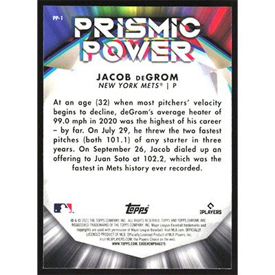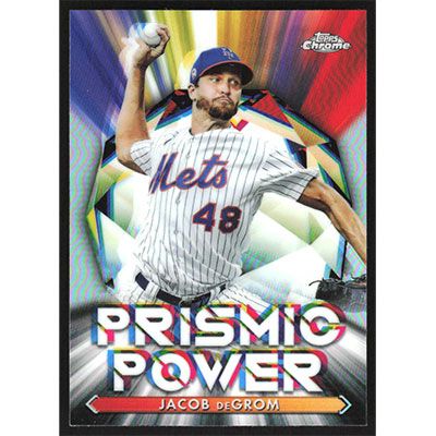 This is a 2021 Topps Chrome Prismic Power Jacob deGrom baseball card. The card is #PP-1 and pictures show condition.