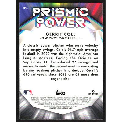 This is a 2021 Topps Chrome Prismic Power Gerrit Cole baseball card. The card is #PP-5 and pictures show condition.