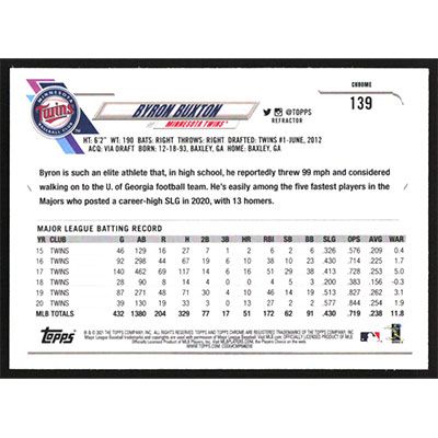 This is a 2021 Topps Chrome Refractors Byron Buxton baseball card. The card is #139 and pictures show condition.