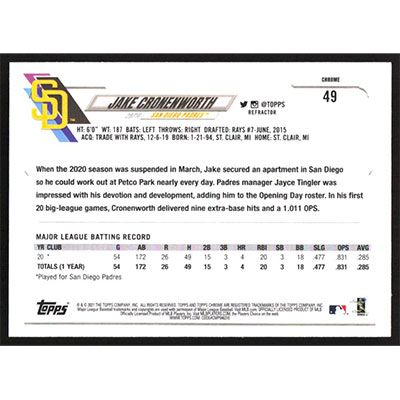 This is a 2021 Topps Chrome Refractors Jake Cronenworth baseball card. The card is #49 and pictures show condition. Team(s): San Diego Padres Rookie Card (RC)