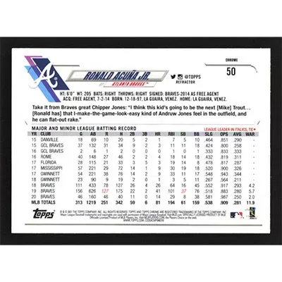 This is a 2021 Topps Chrome Refractors Ronald Acuña Jr. baseball card. The card is #50 and pictures show condition.