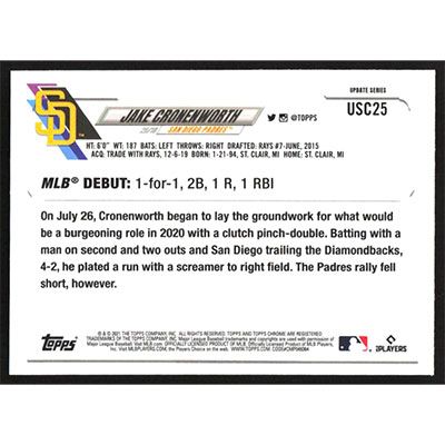 This is a 2021 Topps Chrome Update Purple Refractors Jake Cronenworth Rookie Debut baseball card. The card is #USC25 and pictures show condition. Team(s): San Diego Padres Rookie Card (RC)