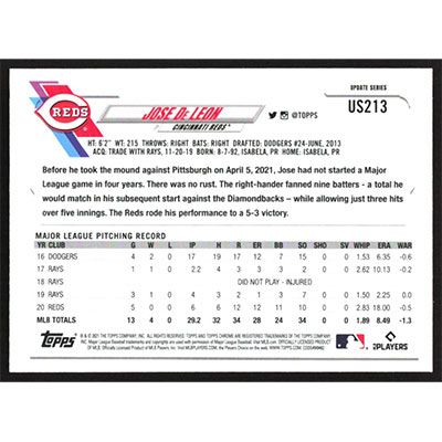 This is a 2021 Topps Chrome Update Sapphire Jose De Leon baseball card. The card is #US213 and pictures show condition.