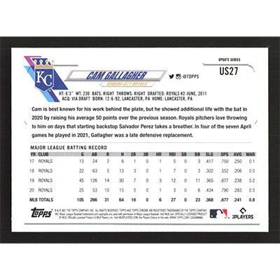 This is a 2021 Topps Chrome Update Sapphire Cam Gallagher baseball card. The card is #US27 and pictures show condition.