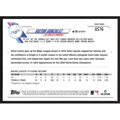 This is a 2021 Topps Chrome Update Sapphire Victor Gonzalez baseball card. The card is #US76 and pictures show condition. Team(s): Los Angeles Dodgers Rookie Card (RC)