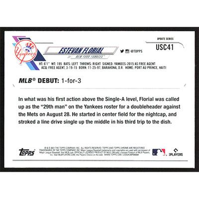 This is a 2021 Topps Chrome Update Estevan Florial Rookie Debut baseball card. The card is #USC41 and pictures show condition. Team(s): New York Yankees Rookie Card (RC)