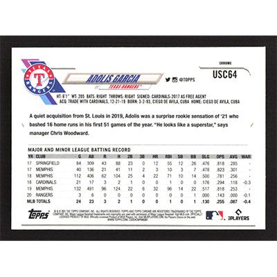 This is a 2021 Topps Chrome Update Adolis Garcia baseball card. The card is #USC64 and pictures show condition.