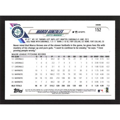 This is a 2021 Topps Chrome X-Fractors Marco Gonzales baseball card. The card is #152 and pictures show condition.