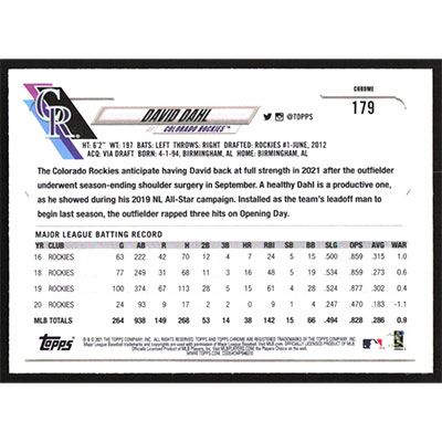 This is a 2021 Topps Chrome X-Fractors David Dahl baseball card. The card is #179 and pictures show condition.
