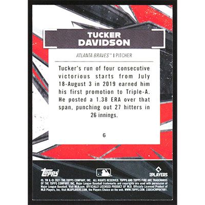 This is a 2021 Topps Fire Tucker Davidson baseball card. The card is #6 and pictures show condition.