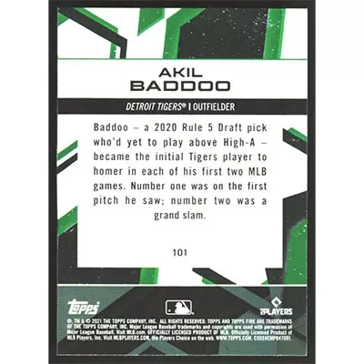 This is a 2021 Topps Fire Akil Baddoo baseball card. The card is #NNO and pictures show condition.