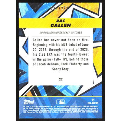 This is a 2021 Topps Fire Orange Zac Gallen baseball card. The card is #22 and pictures show condition. This card is limited; #'d 221/299. Team(s): Arizona Diamondbacks