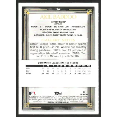 This is a 2021 Topps Gallery Akil Baddoo baseball card. The card is #74 and pictures show condition.